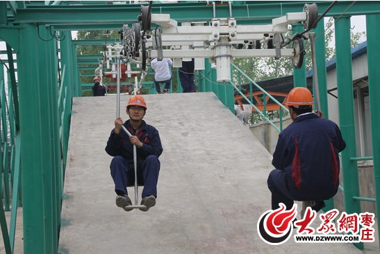 工作人員向記者演示“猴車”乘坐方式。
