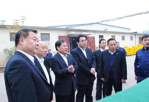 棗礦集團董事長、黨委書記劉成錄(左三),總經理、黨委副書記滿慎剛(左四),副總經理殷濤(左一),新遠大公司董事長(左二),黨委書記王培剛(后右)到公司親切指導。公司經理羅賢峰(右二)陪同指導。