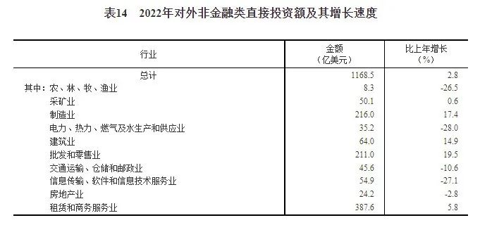 全年對外非金融類直接投資額7859億元,比上年增長7.2%,折1169億美元,增長2.8%。其中,采礦業2022年對外非金融類直接投資額50.1億美元,比上年增長0.6%。